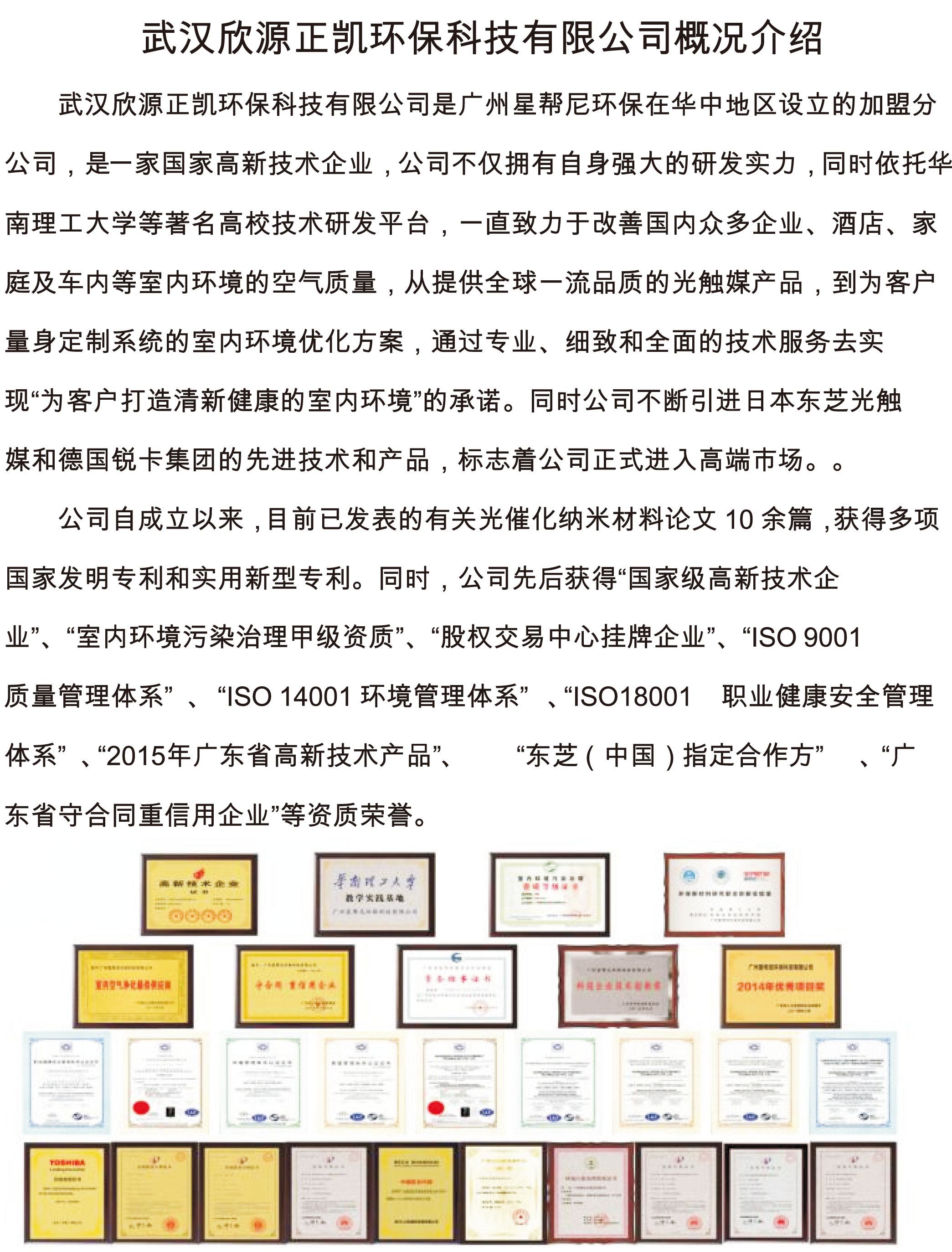 武汉欣源正凯环保科技有限公司是广州星帮尼环保在华中地区设立的加盟分公司,是一家国家高新技术企业,公司不仅拥有自身强大的研发实力,同时依托华南理工大学等着名高校技术研发平台,一直致力于改善国内众多企业、酒店、家庭及车内等室内环境的空气质量,从提供全球一流品质的光触媒产品,到为客户量身定制系统的室内环境优化方案,通过专业、细致和全面的技术服务去实现“为客户打造清新健康的室内环境”的承诺。同时公司不断引进日本东芝光触媒和德国锐卡集团的先进技术和产品,标志着公司正式进入高端市场。